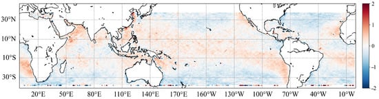 Figure 9 shows the distribution of the wind speed bias between CyGNSS and CCMP-nonzero. We found that negative deviation mainly appears at high latitudes in both hemispheres, and especially in the southern hemisphere. The bias is obvious when the latitude exceeds 30 S. The negative deviation of the northern hemisphere mainly occurs in the Northern Pacific and the north center of the Atlantic Ocean, especially along the east coast of the United States and Australia. However, positive deviations appear in the China Sea, Arabian Sea, and the west of Africa and South America. The red density points reveal where CyGNSS winds overestimate CCMP-nonzero winds for every ocean between 20 S and 20 N, as shown in Figure 9. In particular, the quality of CyGNSS winds in the China Sea is not ideal, with a large SD and a positive bias. In addition, as shown in Figure 8, the map of the wind speed SD between CyGNSS and CCMP-nonzero shows the high accuracy, and the wind speed bias has a small deviation in the adjacent sea region to Malaysia and the Philippines.