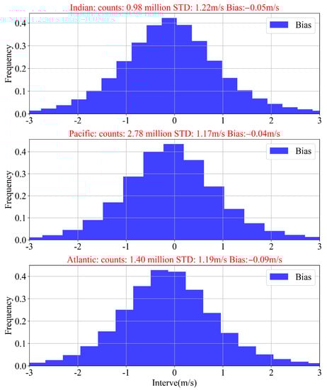 The counts, SD, and bias of NOAA CyGNSS values with respect to CCMP-nonzero ones over the tropical Pacific, Atlantic, and Indian Oceans were investigated and analyzed. The number of collocations in each ocean depends on its size. The accuracy evaluation of the Pacific, Atlantic, and Indian Oceans is shown in Figure 10. The results showed that the difference in the Pacific, Atlantic, and Indian Oceans was non-significant in bias. The mean deviation of the Indian Ocean was m/s with an SD of 1.22 m/s; the mean deviation of the Pacific Ocean was −0.04 m/s with an SD of 1.17 m/s; the mean deviation of the Atlantic Ocean was −0.09 m/s with an SD of 1.19 m/s. Figure 10 also shows the histogram of NOAA CyGNSS winds relative to CCMP-nonzero ones over the tropical Pacific, Atlantic, and Indian Oceans. We see this clearly in Figure 10, where the biases of the Pacific, Atlantic, and Indian Oceans are concentrated between −3 and 3 m/s. The mean deviations for each ocean are negative, which demonstrates the overall underestimation in CyGNSS wind speed over the tropical Pacific, Atlantic ,and Indian Oceans. The performance in the Atlantic Ocean is the worst. The number of collocations can also affect the accuracy. Figure 10 provides the counts of the tropical Pacific, Atlantic, and Indian Oceans. The more likely reason for this finding is that this difference in the three oceans may be determined by their own wind field characteristics, such as the occurrence and geographical distribution of high wind events. Certainly, these differences could also be due to the performance of the CCMP product in different ocean basins. The geographical dependence of the wind speed retrieval error should be further investigated.