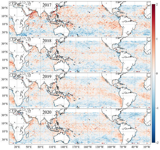 To further determine whether the geographical anomalies are temporally temporary, the interannual variations in the SD and wind speed bias between CyGNSS and CCMP-nonzero were investigated, as shown in Figure 11 and Figure 12. The SD of CyGNSS along the China coast has been improved over time, with the SD (red color) gradually becoming small (white color). Unfortunately, the accuracy remains poor (red color) in the Mediterranean region and the middle-upper region of the Pacific Ocean. The distribution of SD between CyGNSS and CCMP-nonzero in other regions is similar to the average SD in 2018–2020. Figure 12 shows that there was no significant difference in the spatial distribution of the wind speed bias from 2018 to 2020. Note that the global distribution of the wind speed bias in 2017 showed larger errors occurred in the China Sea and Arabian Sea. This is consistent with the result shown in Figure 9. The improvement in the wind speed bias is not as obvious as that in SD over time. Negative deviations mainly appeared in high latitudes in 2017–2020, as shown in Figure 12, especially in the southern hemisphere. This basically confirms that the geographical anomaly is not temporary. The specific reasons may be related to the distribution of wind speed and the retrieval method, which will not be discussed in detail here.