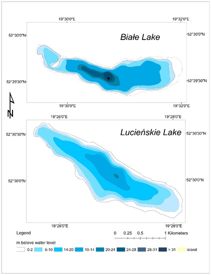The Białe Lake bathymetry is characterized by a high level of depth changes. It reaches its greatest depths in the central part (31 m), while in the western part, there is a shallow water zone with a small island connecting to the northern shore by a high underwater barrier which separates the shallower overgrown part of the lake. The Lucieńskie Lake has an approximately 20% larger area compared to the Białe Lake and its bottom is more proportional (Table 1, Figure 1 and Figure 2). In the north-eastern and eastern parts of the lake, the slope of the lake basin is the smallest and the coastal zone is the widest. In other parts of the lake, the coastal zone is narrow and the slope of the bottom is larger.