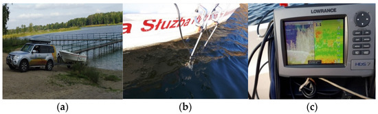 Equipment used during the echosounder measurements owned by IMGW-PIB: (a) Texas 360 boat; (b) mounting the echosounder and side-scan sonar sensors during pilot measurements (20 cm draft); (c) images of the lake bottom analyzed during the measurements on the Full VGA SolarMAX ™ PLUS TFT screen.