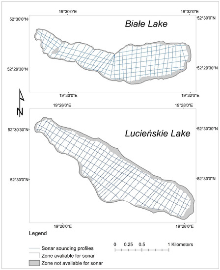 During the measurements, the boat was moving with a speed of approx. 5 m/s. Depth measurements were made in a grid of transverse and longitudinal profiles. The distance between the grid nodes ranged from 50 to 130 m. In total, 52 echograms (39 transverse 13 longitudinal) were created for the Białe Lake. A total of 46 echograms (40 transverse and 6 longitudinal) were created for the Lucieńskie Lake (Figure 4). Measurements were made as close to the coast as possible. In most cases, it was a distance of 30–40 m from the land line. This distance was increased in the case of the dense and tall aquatic reeds (max. 150 m).