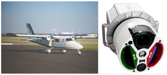 LiDAR data were obtained on 5 September 2019 during a single photogrammetric mission. The measurements were made using the SP-OPG platform by Opegieka Sp. z o.o. (Vulcanair P68C plane, Figure 5). It was equipped with a VQ-1560i DW laser scanner which allows for the measurement in two channels: green and infrared. It performed scanning at different angles. The basic parameters of the LiDAR data registration mission include:
