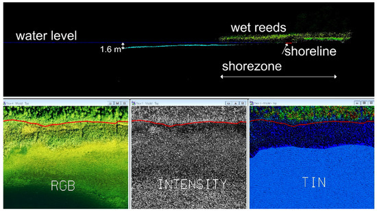 The assessment of the water table range in the shore zone of natural lakes is a technically difficult task due to the dense reed vegetation in the shore zone. The dense reed zones restrict surveying from the boat, while the presence of wetlands limits the availability of shore for geodetic measurements performed from land [44,45]. Additionally, trees and shrubs growing in the shore zone prevent airborne passive imaging (even from low distance) and precise assessment of the shoreline [46,47]. Apart from that, the shore zone under the influence of anthropopressure is remodeled, causing changes in the shape of the shores in a relatively short time (e.g., construction of piers, building artificial beaches, reed mowing). In the interpretation of aerial imaging, problems may be caused by, e.g., watercraft mooring at the shore, the impact of which on the LiDAR point cloud should be corrected. Similar problems apply to the measurements of the lake bottom shape, where the bottom vegetation and semi-liquid sediments constitute an obstacle in the recording and in the interpretation of sonar data, but also require detailed interpretation of all data obtained from water, land and air. Due to this fact, LiDAR scanning appears to be an attractive measurement technology, as long as it enables accurate mapping of the coastal zone [48], however, if precise results are needed, research should be carried out using various methods, thus supplementing the information and improving the possibilities of data interpretation.