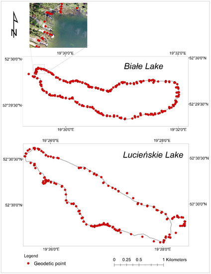 In order to identify the shoreline of the lakes, geodetic measurements of the water table range and additional points, located in cross-sections perpendicular to the course of the shoreline covering the land–water transition zone of both lakes, were performed. For this purpose, the GNSS CHC/X900 + M with RTN mode (Real-Time Networks) receiver was used, based on surface corrections from the network of reference stations of the ASG-EUPOS system (www.asgeupos.pl, accessed on 1 April 2021) with an accuracy of +/−0.05 m. The closed areas around the Lucieńskie Lake and inaccessible wetlands located between the lakes were omitted. Measurement points were selected in accessible areas of the shoreline (Figure 7) using beaches and exposed (not covered by forest) shores, platforms, and other water structures. A total of 261 points measured on the Lucieńskie Lake and 413 points on the Białe Lake, were located in cross-sections perpendicular to the shoreline and placed where the vegetation did not limit the visibility. The obtained results were transformed to .shp format (ArcGIS) in the Coordinate System 1992 (EPSG code: 2180) and in the Kronsztadt 86 height system.