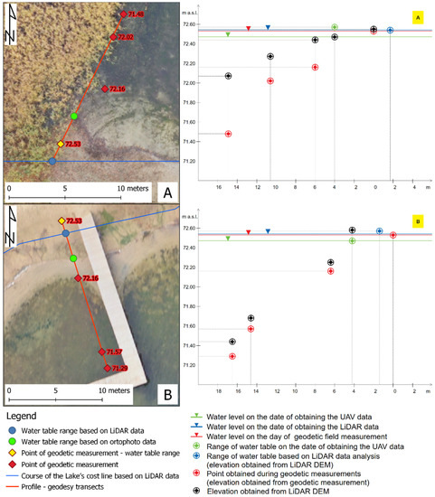 In order to assess the relationship between the results of different measurement types (geodesy, UAV data, sonar and LiDAR) which are collected at different times, the analysis of the water table level at a particular date is of highest importance. Taking into account the fact that the level of the lake’s water table differed during the measurements performed with various methods (Table 3), the analysis of the shoreline course and water depth were reduced to the water table level occurring during sonar measurements. The water table level was measured in the transects perpendicular to the lake coastline. The results of these measurements allowed for the analysis of differences in the water level occurring on the days of LiDAR scanning and sonar scanning (see Section 3.5).