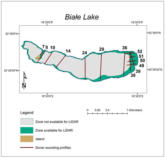 The LiDAR scanning results of both lakes are different from each other. There were no points of reflection of the green beam from the bottom on Lucieńskie Lake. It is related to the low water transparency expressed as a low value of the Secchi Depth. With the average transparency below the Secchi Depth equal to 1.35 m, as in the case of the Lucieńskie Lake, light penetration is practically impossible [53,54]. In the case of the Białe Lake, over 3.5 million LiDAR points classified as the bottom were identified, covering a total of approx. 20% of the lake’s surface (Secchi Depth value for the Białe Lake = 3.7 m), with a maximum measured depth of 1.6 m. The large difference for the depth measurements achieved by the sensor in relation to the clarity of the water is possibly related to the algae growth in the water reservoir. This is clearly visible in the Lucieńskie Lake, where the LiDAR penetration has been completely blocked. In the case of the Białe Lake, the values were twice lower than expected—which is probably also due to the development of aquatic vegetation (algae). According to unpublished information from Opegieka Sp. z.o.o., the same sensor was able to reach depths up to 10 m in the Baltic Sea. It should also be noted that a good agreement was seen when comparing the obtained scanning depths and the Secchi Disk (SD) values. The lack of such compliance in the case of inland lakes is most likely due to the high concentration of vegetation in the water. Another reason may be the nature of the lake bottom, which is often built up by organic sediments that absorb light.