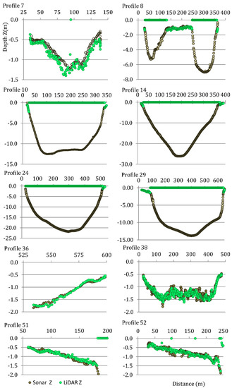 The analysis of the possibility of using a scanner equipped with a green and infrared beam carried out in this study showed acceptable results of water table level detection, comparable to the results obtained by other authors [49,50]. Detection possibilities decreased in areas covered with dense plant cover in the shore zones. The obtained averaged values of the obtained deviations oscillated in the range of measuring accuracy of GNSS and LiDAR. In the detailed analysis, the differences in determining the elevation of shoreline did not exceed 0.6 m, but the highest difference was observed in a few special cases, probably caused by an antropopressure-related change of the bank. The average deviations expressed by the value of the standard deviation did not exceed 0.16 m. This result should be considered satisfactory due to the limitations of the LiDAR and GNSS technologies themselves, therefore, in a similar comparison of these technologies by [45], no correlation was obtained for the depth below 10 cm.