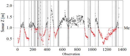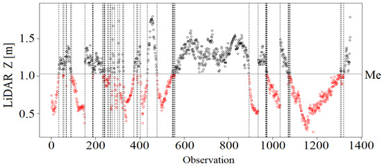 Statistical tests of the two analyzed variables Sonar Z and LiDAR Z sequences confirmed their dependence and stationarity. The runs test showed that for each analyzed variable, the number of observations above and below the median was different (Figure 14), and the p-value was lower than the significance level of α = 0.05 adopted in the study (Table 6). In such a situation, it was concluded that the verified null hypothesis about the independence of the tested random variable should be rejected. It was found that the realizations of both sequences are not random, and their selection for the sample is subject to a tendency or cyclicality, i.e., the tested random variables are dependent.
