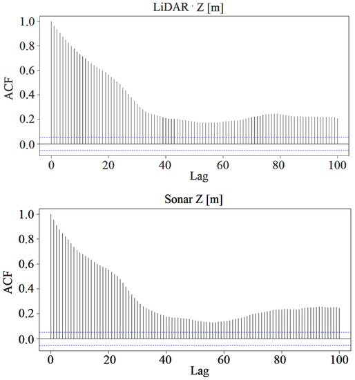 In the next stage, the dependence and stationarity of the sequence obtained from both measuring devices were verified. In the first case, the runs test [39] was used, verifying the number of observations above and below the median value and determining the test probability, i.e., the p-value. Moreover, the autocorrelation of sonar Z (the lake’s water depth measured by the SONAR, in meters) and LiDAR Z (the lake’s water depth measured by the LiDAR, in meters), which represent a measuring sequence of the sonar and LiDAR data, respectively, for the delay Lag = 100, was investigated. The Lag assumed in the study was considered sufficient to identify the occurrence in data sequences. The stationarity of both analyzed measurement sequences was verified with the use of two tests, i.e., the Augmented Dickey–Fuller test and the ADF test [40], for which the null hypothesis assumes non-stationarity of the tested sequences, and the Kwiatkowski–Phillips–Schmidt–Shin (KPSS) test [41], in which the null hypothesis assumes the stationarity of the random variable under study. The ADF test takes into account the existence of a trend in the tested measurement sequences by appropriate selection of the critical value of the test for the significance level of α = 0.05 [40].