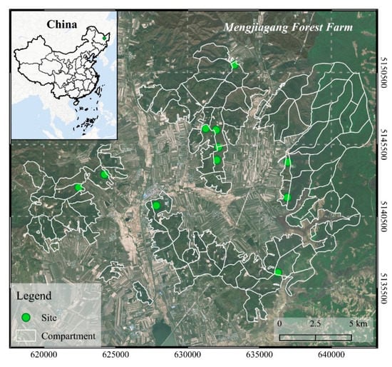 This study was conducted in the Mengjiagang Forest Farm (130°32′42″−130°52′36″ E, 46°20′16″−45°30′50″ N), located in the northeastern area of the Huanan County, Heilongjiang province, China. The forest farm is specifically situated in the western foothills of Wanda mountain. The slope is relatively gentle, most of which is between 10° and 20°. The terrain is higher in the northeast and lower in the southwest, with a maximum, minimum, and average altitude of 575 m, 170 m, and 250 m above sea level, respectively [57]. This area pertains to a temperate continental monsoon climate, and the soil type is mostly dark brown forest soil. The forests are primarily dominated by artificially grown coniferous trees, including Larix olgensis, Pinus sylvestris var. mongolica, and Pinus koraiensis.