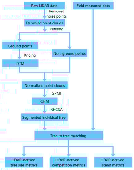 The UAV-LiDAR data processing and metrics extraction can be found in Figure 2. The noise points were masked off manually from the raw LiDAR data, and the remaining points were divided into ground points and non-ground points by using cloth-simulated filtering [59]. To generate digital terrain models (DTMs), the ground points were interpolated by a Kriging spatial interposition method with a 0.5 m pixel size [60]. Then, the normalized height of each point was obtained by subtracting the DTM value from the elevation of all points [61]. We applied a canopy filtering method called graph-based progressive morphological filtering (GPMF), which was used to obtain the canopy height model (CHM) from LiDAR data. GPMF might prevent data pits obtained by traditional methods from damaging the integrity and smoothness of the tree canopy, leading to a large error in the extraction of tree parameters [62]. The resolution of CHM was set to 0.1 m. The individual tree canopies were detected automatically from the CHM using the region-based hierarchical cross-section analysis (RHCSA) algorithm [63]. This algorithm treats CHM as a mountain terrain and uses the crown’s horizontal relation in the vertical direction to detect a single tree.