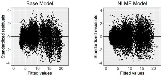 where and are the random effects caused by the site on and , respectively; and are the random effects caused by the sample plot nested in the site on and , respectively; and other symbols have been described in previous sections. Figure 3 shows the standardized residuals distribution of the base model and calibrated NLME model. The weighted power function significantly stabilized the heteroscedasticity. The values of the power variance functions are listed in Table 3.