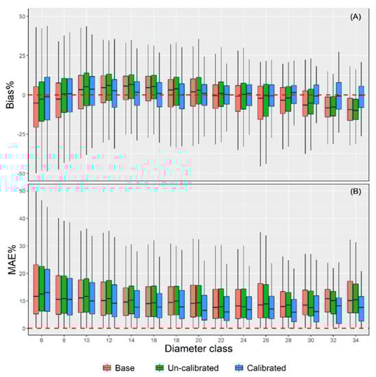 The boxplots of Bias% (A) and MAE% (B) of the three models across 15 diameter classes.
