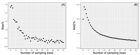 We randomly selected 1−50 trees from each site for site-level local calibration using the BLUPs theory, which is repeated continuously for 1000 times to calculate the average of the error statistics (MAE% and Bias%). The results of the calibration response mode are shown in Figure 6. For site-level calibration, only when the subsample is more than five, the prediction effect is better than that of the uncalibrated model. MAE% gradually decreased with the increase of sampling number. The overall trend of Bias% is similar to MAE%, although there are slight fluctuations. When the subsample size is 15, MAE% was reduced to 11.5%. Increasing the number of samples was not significant to improve the model’s accuracy but it will increase the cost of measurement. Therefore, there is always be a tradeoff between the cost and accuracy, in which selecting 15 trees randomly for site-level calibration might be recommended as the best compromise between the two.