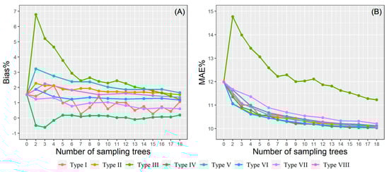Type VI: Selecting largest trees and medium-size trees per plot (: 2, 4, …, 18).