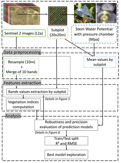 Figure 1 presents the materials and methodology used in this study. The first step is the data acquisition including S2 images acquisition and vine water status measurements on vine subplots (Section 2.1). Then the data preprocessing (Section 2.2) consists of resampling and merging S2 images as well as average the SWP values at the subplot-level.