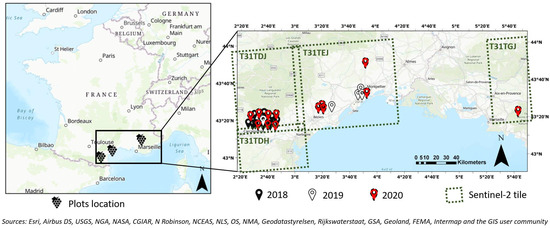 Location of the study vine plots for 2018, 2019 and 2020 and position of the corresponding S2 tiles.