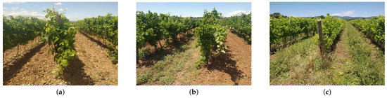 Inter-row management example. (a) Plot ungrassed. (b) Plot with grass one row on two. (c) Plot totally grassed.