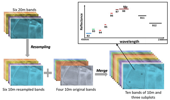 Flowchart of the resampling and the merge of S2 bands used in this study. Example for an image with only one vine plot with three subplots. This method as been used for the 38 images and the 103 subplot.