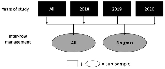 Table 2 gives details about the number of plots and subplots for each year, by inter-row management and by variety. As expected, the Syrah variety is the most represented as it is the most common in the region but other grape varieties were added during the investigation in order to increase the variability within the database.