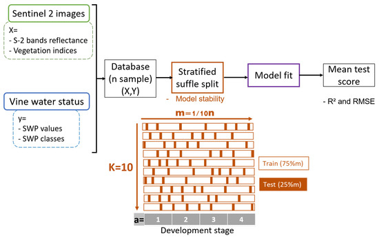Figure 7 gives the analysis details. In a first part, a test of the robustness and precision of each algorithms is done with each feature (S2 bands values and VI) and each sub-sample (Years and inter-row management). A stratified suffle split is used to split the dataset into 10 parts (k = 10) in order to test the stability of the model. Into each of the 10 parts, attention has been paid to keep samples from all the studied development stages (a). For each 10 parts, 75% of the sample are used for the training and 25% for the test.