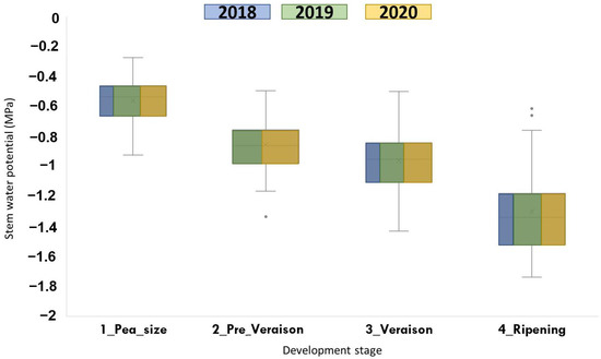 A box plot of the SWP values for each development stage is given in Figure 8. As expected, the mean values decrease during the season but differences are also observable for a same stage (from −0.4 MPa to −1.4 MPa at veraison for example).
