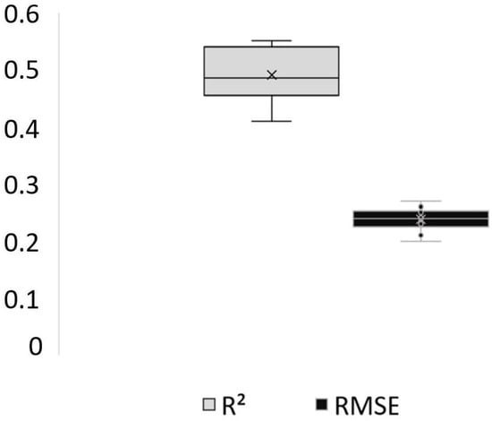 For each split, the determination coefficient () and the Root Mean Square Error (RMSE) are computed for each algorithm according to the following formulas: