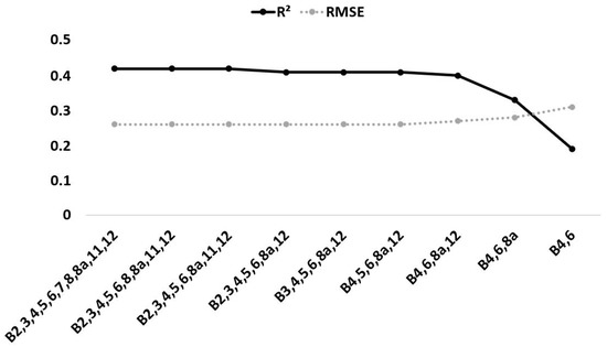 The significance of the bands used to build the model is checked with the p-value and their coefficient in the model. Then, we recursively remove non-significant bands or bands with the smallest coefficients until scores ( and RMSE) decline.