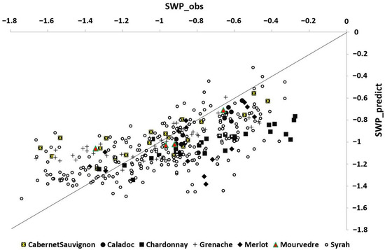 Most of the measurements were made on Syrah grape variety (Table 2) because it is the most common one in the study region. Nevertheless additional varieties were added in 2019 and 2020 to expend the scope of our initial survey. This way we were able to include both isohydric (Cabernet-Sauvignon, Grenache, Caladoc) and anisohydric grape varieties (Syrah, Chardonnay, Merlot, Mourvèdre) which behave differently to water stress. Anisohydric varieties maintain their stomata opened to ensure photosynthesis and can be damaged in case of strong water stress while isohydric varieties close their stomata when the first signs of drought appeared and thus limit their photosynthesis [54]. Despite these distinct behaviors, we do not see any real differences in the predictions as shown in Figure 12 and the model seems to be able to predict correctly the SWP both for isohydric and anisohydric varieties. To extend the study it would be interesting to focus on more isohydric varieties and to add other varieties common in other regions (e.g., Merlot in the Bordelais region).