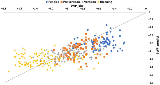 Following the trends observed in Figure 13, the model appears to be less efficient when considering data at ripening stage. This may be due to other physiological mechanisms that affect the plant when under high water stress, such as sugar accumulation in berries and modification in leaf area to fruit ratios [55], that could also affect the optical properties of the leaves. The objective of the study was to develop a model that could be used for images acquired at any stage of vine development. Nevertheless, tests were made without data from ripening stage to evaluate the impact on predictions. The models results were ultimately not better (max ), indicating that general model is more relevant, even if it is more accurate only when considering pre-veraison and veraison stage. This is rather positive those stages are the ones where winegrowers have to be careful on water stress as it can delay the good development of the berries.