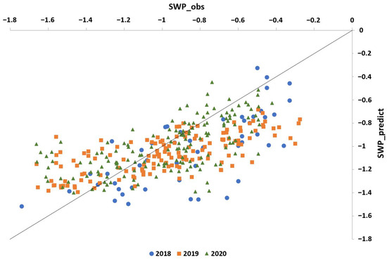 A first observation to highlight is that a threshold effect seems to appear for values to predict lower than −1.4 MPa. This can be explained by the fact that −1.4 MPa already reflects a very high water stress [53].