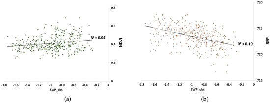 As previously reported in the literature, the most discriminant bands, highlighted in Section 3.3.1, are located in Red-Edge (B6) [49], NIR (B8a) [50] and SWIR (B12) [51]. The Red domain (B4) is also highlighted in this study as in [26]. This domain is related to pigments which also react to water stress (xanthophyll and chlorophyll) according to [52]. Except the REP, no other vegetation index appears to be interesting enough in our study to predict the vine water status with the algorithms we tested. Therefore the direct use of S2 bands seems to be more relevant.