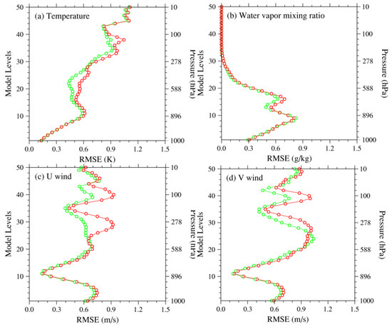 Domain-averaged RMSEs of vertical profiles of the (a) temperature, (b) water vapor mixing ratio, (c) U and (d) V increments of the EXP_AD (green) and EXP_AMD (red) at the initial time at 0600 UTC on 7 August 2019.