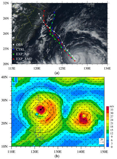Figure 4a shows the three-day best track along with the forecast tracks of the CTRL, EXP_AD, and EXP_AMD from 0600 UTC on 7 August 2019. Only the EXP_AMD could forecast the landfall of typhoon Lekima, indicating its good performance in simulating the steering flow. Figure 4b,c shows the comparison of mean wind flows, wind speed (shaded) and calculated steering flows from the 48 h forecasts in the EXP_AD and EXP_AMD. The direction of the simulated steering flow changed from southwest in the EXP_AD to southeast in the EXP_AMD, which contributed to the northwest movement of typhoon Lekima.