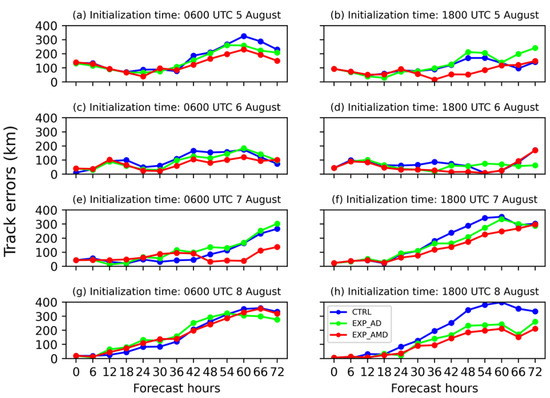 (a–h) 72 h track errors (unit: km) of the CTRL (blue), EXP_AD (green), and EXP_AMD (red) with the model initialization times at 0600 UTC (left panel) and 1800 UTC (right panel) from 5 to 8 August 2019. The x-axis represents the forecast hours (unit: h).