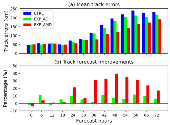 where R represents the radius of the earth, and λ and φ are the longitude and latitude, respectively. In general, the EXP_AMD performed the best in the track forecast with the leading time of 36 h to 72 h, followed by the EXP_AD, which indicated the good performance when the AMSU-A and MWTS-2 data were both assimilated into the model. The mean track errors and percentages of improvement, i.e., (EXP_AD–CTRL)/CTRL and (EXP_AMD–CTRL)/CTRL, are shown in Figure 6. There was no significant improvement from the initial time to the 30 h forecasts by the EXP_AD and EXP_AMD compared with that by the CTRL. However, the mean track errors, calculated by averaging track errors of eight different initial times from Figure 5 with the forecast hours of 42 h to 72 h by the EXP_AD, decreased by 8.7% (~18.4 km) approximately, while the mean track errors of the forecasts, with the leading time of 36 h to 72 h by the EXP_AMD, reduced by 30% (~58.6 km).