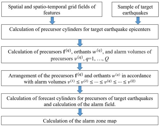 37]. Forecast training is carried out according to the precedents of the occurred target earthquakes. The learning-based minimum alarm zone method systematically calculates a predictive alarm zone map in which a target earthquake with a magnitude greater than a predetermined magnitude is expected. The alarm zone is determined by the function of the grid spatio-temporal fields of features calculated on the basis of the initial data. For many seismically active regions, the quality of machine learning for predicting strong earthquakes is limited by a small number of precedents. Our method uses a mathematical model that allows, during training, to select anomalies in feature fields that precede target earthquakes, compare these anomalies with each other, and select other anomalies in feature fields similar to those selected during training. This model introduces constraints on the prediction rule that help compensate to some extent for a small number of use cases during training.