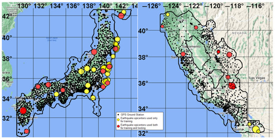 The initial training intervals started for Japan and California on 1 January 2011 and 23 December 2009 and ended before the next forecast, starting on 20 November 2015 and 19 January 2013, respectively. The testing intervals were 20 November 2015–10 September 2020 for Japan and 19 January 2013–14 November 2020 for California. The areas of analysis at the testing intervals contained 14 epicenters of target earthquakes in Japan with a magnitude of