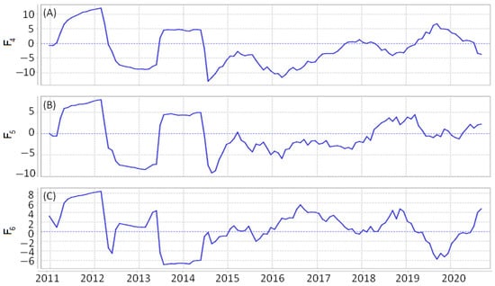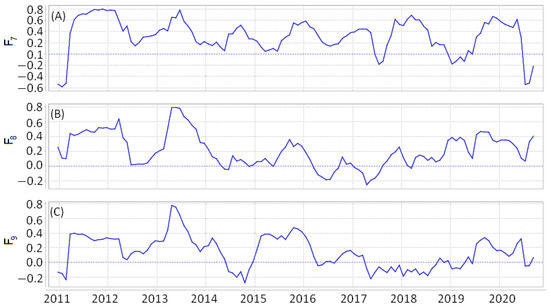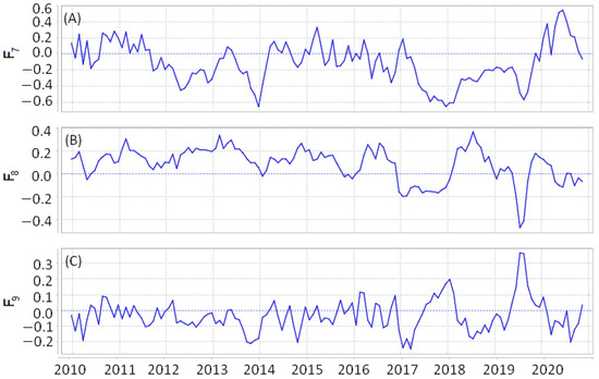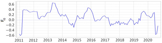 The estimation of 3D fields and was performed with the method of local kernel regression. The kernel function for the q-th earthquake has the form , where and are the distance and time interval between the q-th epicenter of the earthquake and the node of the 3D grid of the field, , km, days for and R = 100 km, and T = 730 days for . The field was calculated with the kernel function . The parameters for evaluating the fields, the radii R, and the interval T were chosen empirically, considering the step of the network of fields and the approximate number of events in the evaluation window. To calculate the fields , , , and , Student’s t-test was used. This t-statistic was determined for each grid node as the ratio of the difference in the average values of the current interval and the background interval to the standard deviation of this difference. Positive values of the t-statistic correspond to an increase in the value on the test interval.