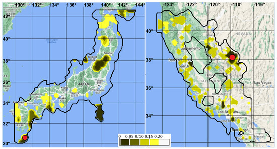 for California take on anomalous values. Shaded alarm zones indicate the volume of the alarm. The level of shading of the alarm zones shows the value of the alarm volume. On alarm zone maps, these values are approximately equal to fractions of the alarm area relative to the analysis area. On the maps, target events fell into subdomains: for Japan, the proportion of the alarm area is about 15%, and for California, about 3%.
