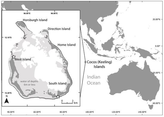 The Cocos (Keeling) Islands (North Keeling atoll not shown). West and Home Islands have permanent settlements, while Direction Island is a popular tourist location. South Island is more remote and is visited infrequently. Location of field sites indicated with stars, the barrier reefs are shown in dark grey and areas of shallow water in light grey.