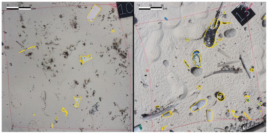 Plastic items within quadrats were digitised to determine the apparent surface coverage of plastic debris (yellow outline).