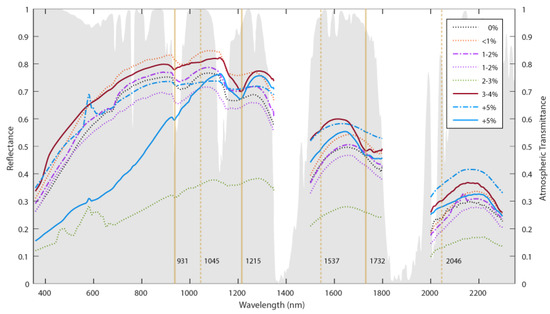Average spectra of representative quadrats collected on Cocos (Keeling) Island beaches, including a quadrat with no MPD and quadrats with varying MPD abundance (<1%, 1–2%, 2–3%, 3–4% and +5%). The presence of organic matter like seaweed in some quadrats reduced overall reflectance. Wavelengths of interest for plastic detection are shown as vertical lines. Modelled atmospheric transmittance is shown as shaded grey to illustrate the position of atmospheric windows [Adapted with permission from [52] ©The Optical Society].