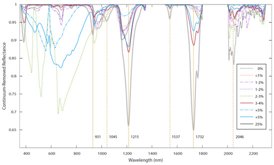 Average continuum-removed reflectance of representative quadrats collected on Cocos (Keeling) Island beaches, including a quadrat with no MPD, quadrats with varying MPD abundance (<1%, 1–2%, 2–3%, 3–4% and +5%) and an intentionally created quadrat with 25% surface cover. Vertical lines show the position of absorption features identified in the literature [30]. Plastic absorption features at 931 nm, 1045 nm and 2046 nm were not readily distinguishable in the in situ quadrats when compared to the quadrat with no MPD. The 1215 nm feature and the 1732 nm features are distinguishable when compared to the sand-only sample.