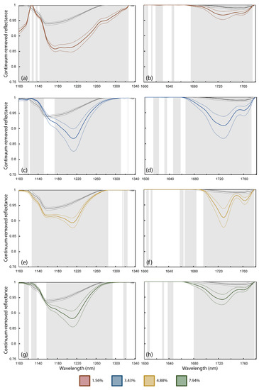Continuum-removed reflectance of quadrats that had statistically significant differences in spectra when compared to a control sand group. The mean and 95% upper and lower confidence intervals are shown for both sand-only spectra (dark tones) and the MPD contaminated quadrat (in colour). Statistically significant differences are shaded in grey. Quadrats exhibited surface covers of (a) 1.56% at 1215 nm and (b) 1732 nm, (c) 3.43% at 1215 nm and (d) 1732 nm (e) 4.88% at 1215 nm and (f) 1732 nm and (g) 7.94% at 1215 nm and (h) 1732 nm.