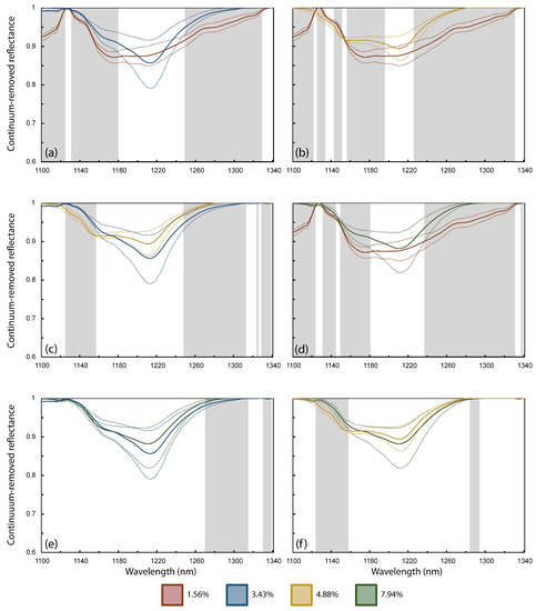 Continuum-removed reflectance of samples that were statistically different from sand spectra around 1215 nm, compared to each other. The mean and 95% upper and lower confidence intervals are shown for the MPD contaminated quadrats in each graph (in colour). Statistically significant differences are shaded in grey. Sample pairings are (a) 1.56% and 3.43% (b) 1.56% and 4.88% (c) 3.43% and 4.88% (d) 1.56% and 7.94% (e) 3.43% and 7.94% and (f) 4.88% and 7.94%.
