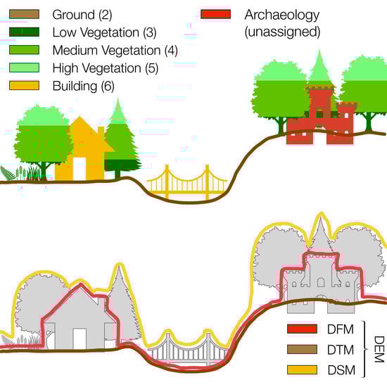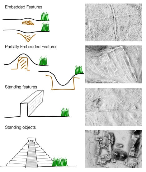 A DFM is an archaeology-specific gridded surface model—a product of archaeology-specific LiDAR data processing. It combines ground features with archaeological micro-relief features and buildings. To properly describe a DFM, therefore, archaeological features need to be specified. There are many different archaeological features, but four morphological types can be distinguished (Table 2; Figure 5). Most archaeological features detected using airborne LiDAR data fall into the first two types—embedded or partially embedded features—which are to some degree part of the ground and, hence, the DTM. This explains why archaeologists are able to detect many archaeological features using a general purpose DTM. However, standing features and standing objects are off-terrain features. As such, they are intentionally excluded from DTMs. In addition, partially embedded features may be misrepresented in a general purpose DTM because of smoothing or similar. Furthermore, while standing objects in point clouds can often be correctly classified using algorithms designed for buildings, there is currently no off-the-shelf solution for detecting standing features in areas with even modest low and medium vegetation (ASPRS classes 3 and 4, respectively). As a consequence, in many cases DFM-specific data processing must include ample manual reclassification [7].