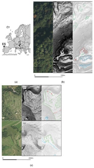 Test data: (a) location of test sites: AT—46°53′05″N, 15°30′48′′E, SI1—45°40′21″N, 14°11′40′′E, SI2—45°40′56″N, 14°12′25″E, ES—42°44′30″N, 8°33′02″E; (b) test site AT; (c) test sites SI1 and SI2; (d) test site ES. (b–d): shown at 100% crop size; left-digital orthophoto; middle-enhanced visualization of manually processed DFM; right-archaeological features (blue: embedded features; green: partially embedded features; red: standing features). DFMs are visualised using sky view factor (RVT 2.2, default settings; after [1], Figure 1; CC-BY 4.0).