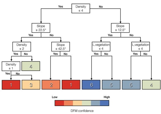 Therefore, we propose a modified CART classification tree with which to extract the DFM prediction uncertainty map, which we refer to as the DFM confidence map (Figure 3). Our CART tree is modelled after the proposal of Bater and Coops, who considered point density to be more important than slope. We modified the starting value for the ground point density according to the DFM specifications: The point density must be approximately equal to the grid density. The interpolator used is IDW. The slope conditions follow Bater and Coops, who defined thresholds at 12.5, 22.5, and 42.5°. To this, low vegetation was added following the decision tree structure of Montealegre and colleagues, but with vegetation height between 0.5 and 2.0 m. We defined the threshold for low vegetation density with the grid density: Vegetation is significant if its density is higher than the grid density, for example, more than 1 point per m2 for a grid cell size of 1 m2. This estimate roughly corresponds to a forest with a dense or very dense understory ([42]: structural categories C and D). The DFM confidence map has six confidence levels, with one being the lowest and six being the highest confidence.